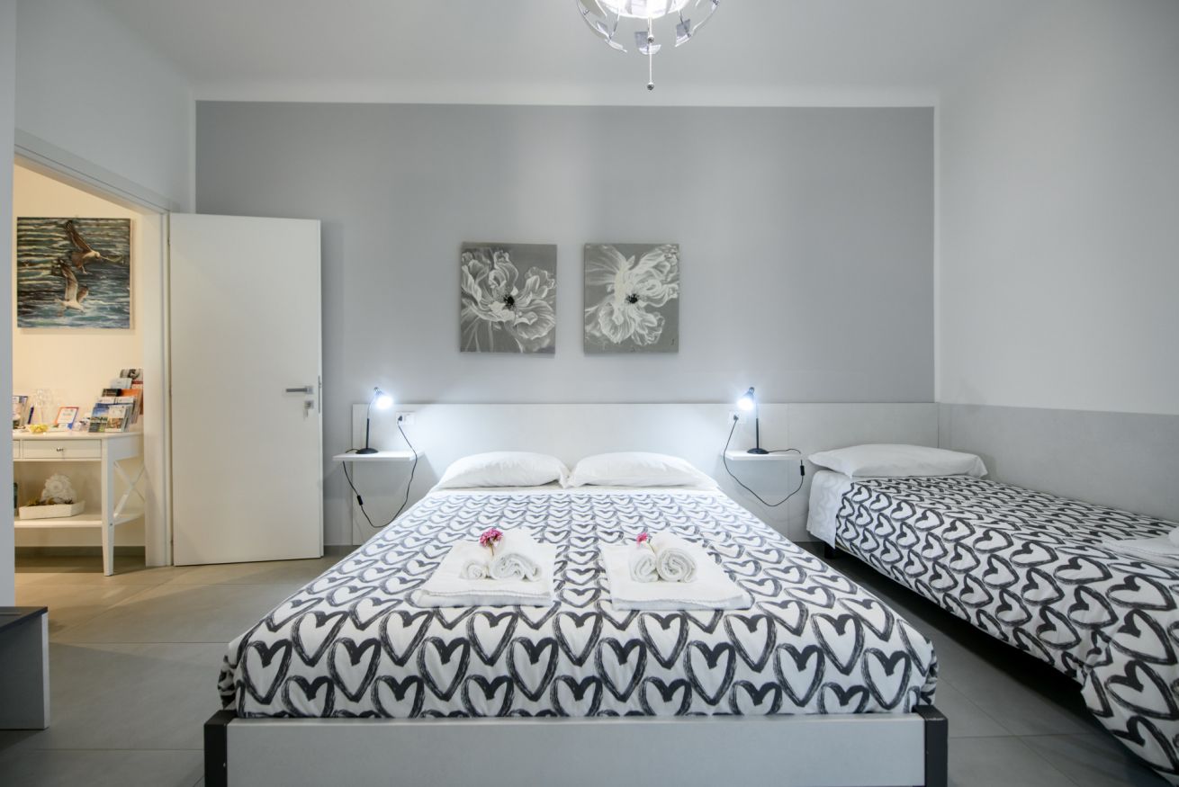 Accogliente e spaziosa, situata al primo piano, la Camera Iris è ideale per famiglie o piccoli gruppi di amici. La combinazione matrimoniale + letto singolo permette di ospitare comodamente fino a 3 persone, mantenendo privacy e comfort. Il bagno privato in camera garantisce praticità, mentre Wi-Fi veloce e Smart TV completano l’esperienza, perfetta anche per chi alterna mare e lavoro da remoto.