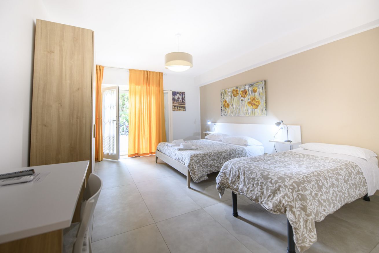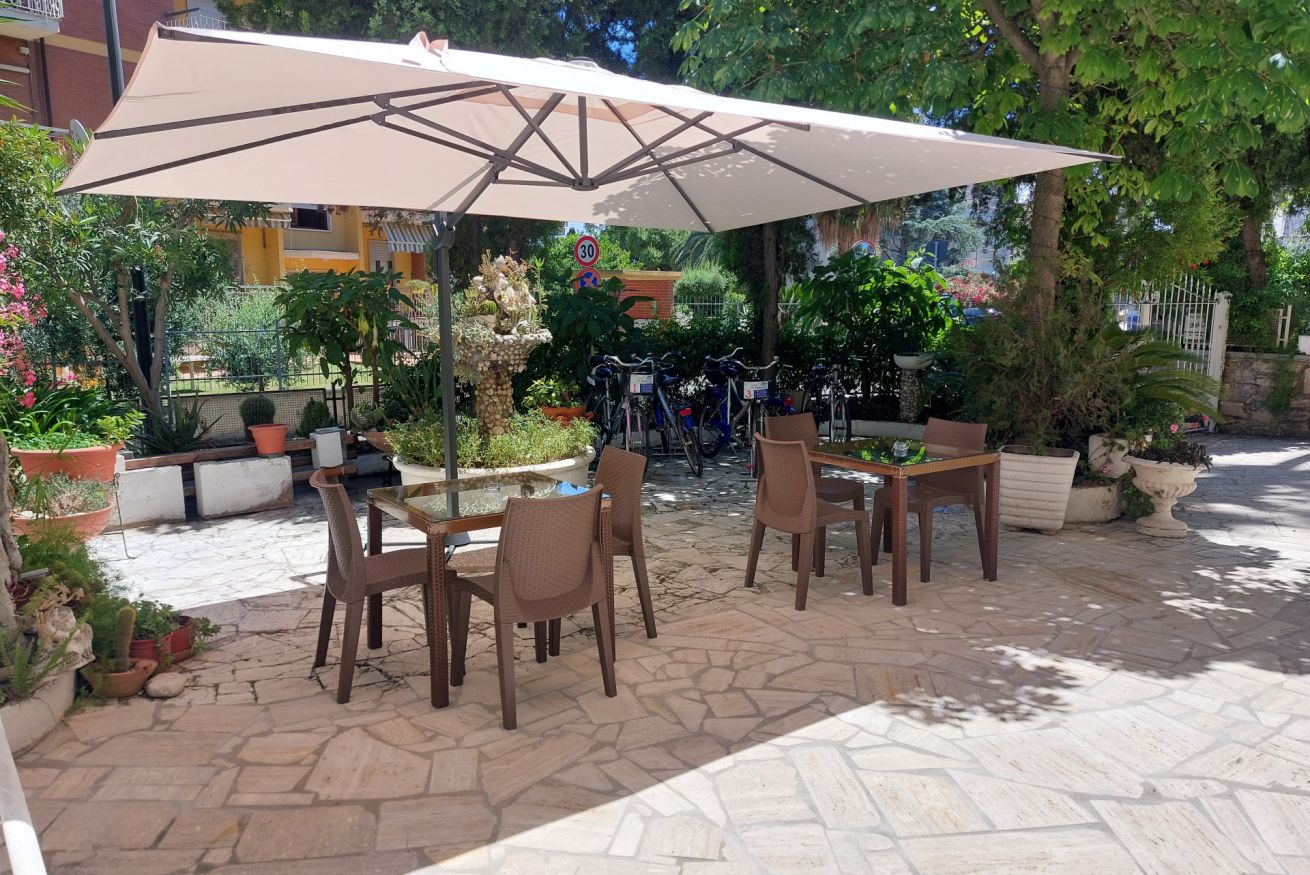 All’esterno, l’ampio giardino arredato è il vero plus: un angolo verde dove leggere, chiacchierare o fare colazione all’aperto. Per vivere al massimo la città e il lungomare, è disponibile anche il noleggio biciclette, pratico e divertente per raggiungere la costa in pochi minuti.