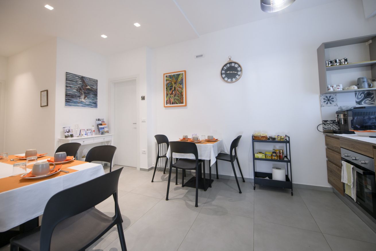 La colazione si svolge in una zona comune al primo piano, affiancata da un salone condiviso: ambienti piacevoli e rilassanti dove iniziare la giornata con calma o concedersi una pausa al rientro. Gli ospiti potranno usufruire di una colazione base dolce, con una selezione di prodotti confezionati e freschi: cereali, yogurt, succhi di frutta, acqua, tisane, fette biscottate, marmellata, crema spalmabile alla nocciola e un dolce fresco del giorno, come crostata, ciambellone o similari.