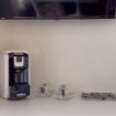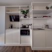 Angolo cottura moderno e completo: piano a induzione, microonde, frigorifero, tostapane, macchina del caffè e stoviglie