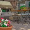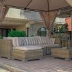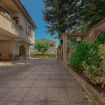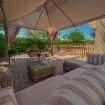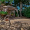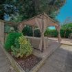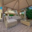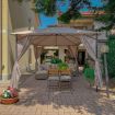 Grande giardino arredato con gazebo, tavolo, sedie e area relax