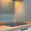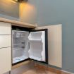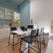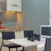 Cucina completa attrezzata con piano cottura a induzione, frigorifero, forno a microonde, macchina del caffè e tavolo da pranzo con 4 sedie