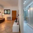 Zona giorno luminosa con divano, smart TV e specchio a figura intera