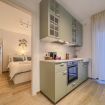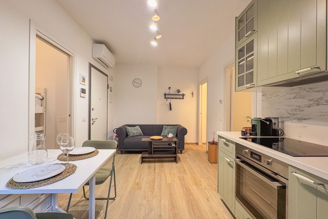 Zona giorno open space con cucina completa (forno, piano a induzione, macchina del caffè, stoviglie), tavolo da pranzo e divano.