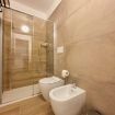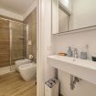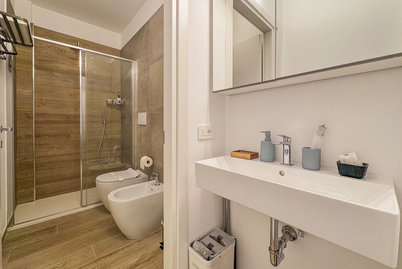 Bagno moderno con grande doccia, lavatrice e tutto il necessario per un soggiorno prolungato.