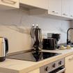 Cucina completamente attrezzata: forno, frigorifero, macchina del caffè, bollitore, tostapane, stoviglie e utensili.