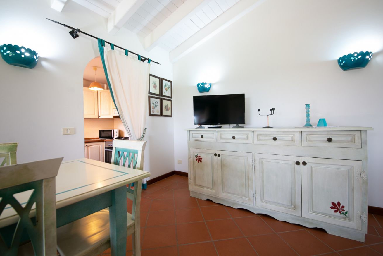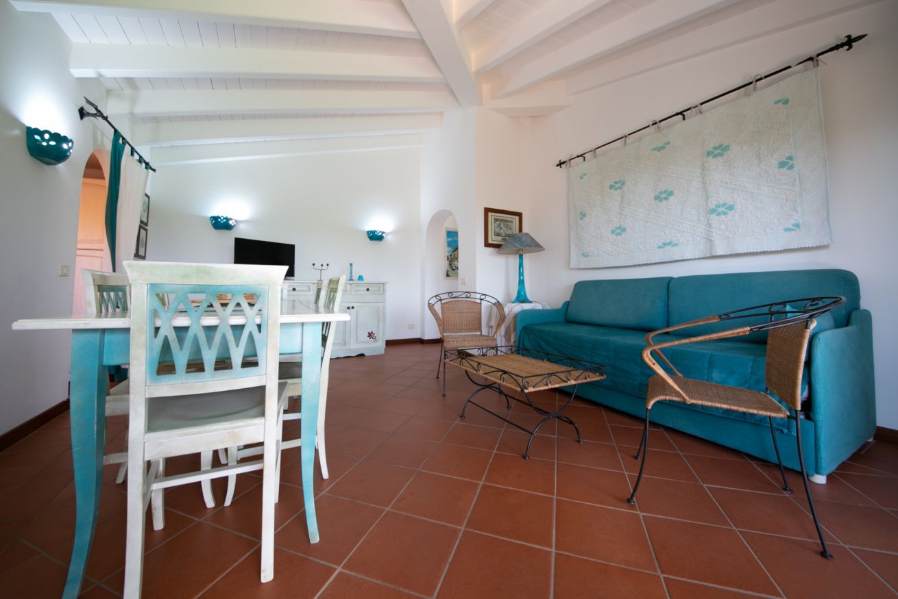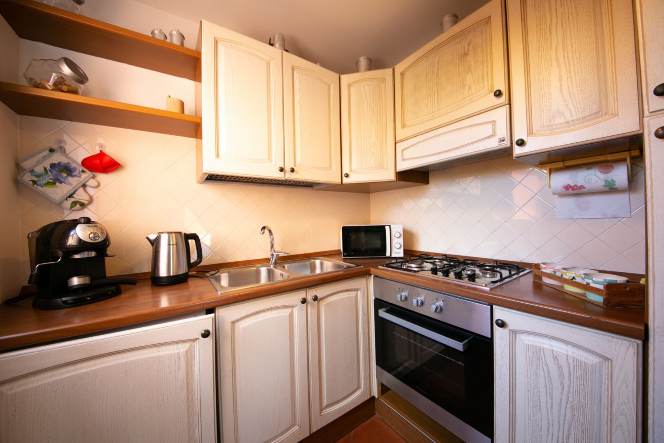 Gli interni sono accoglienti e ben strutturati. La zona giorno comprende un salotto con zona pranzo e TV, oltre a un divano letto matrimoniale, ideale per ospitare comodamente due persone in più. La cucina completamente attrezzata dispone di forno, frigorifero, macchina per il caffè e tutto il necessario per cucinare.